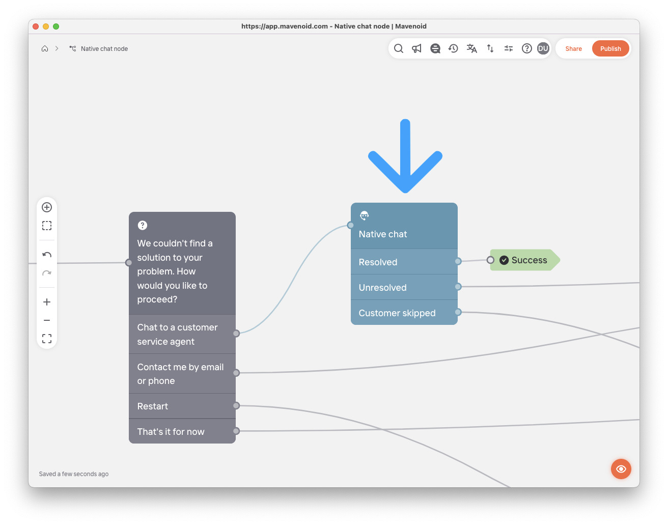 Native chat nodes allow end users to connect with your support agents. When a conversation enters a native chat node, a chat is initiated in the chat dashboard your agents are already using. After the chat concludes, the user's conversation continues in Mavenoid.