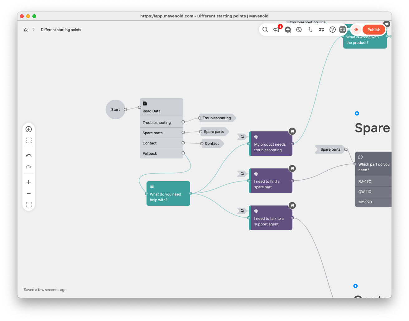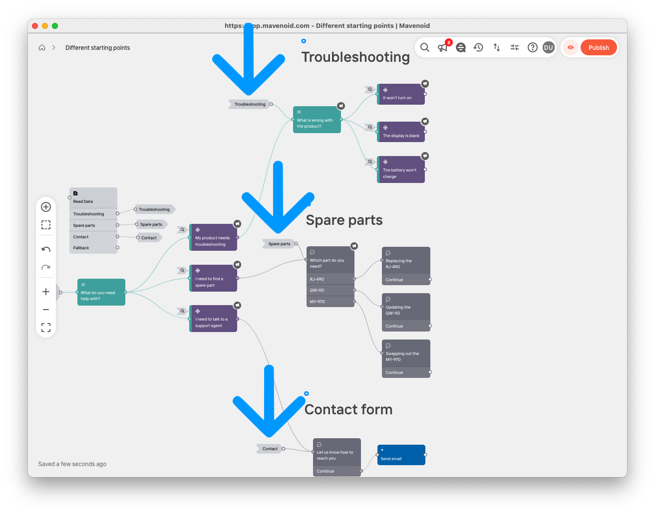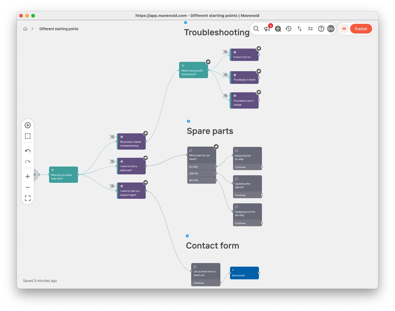 For this example, we will imagine a flow that covers three use cases: troubleshooting, spare parts, and a contact form. The start of the flow might look something like this: