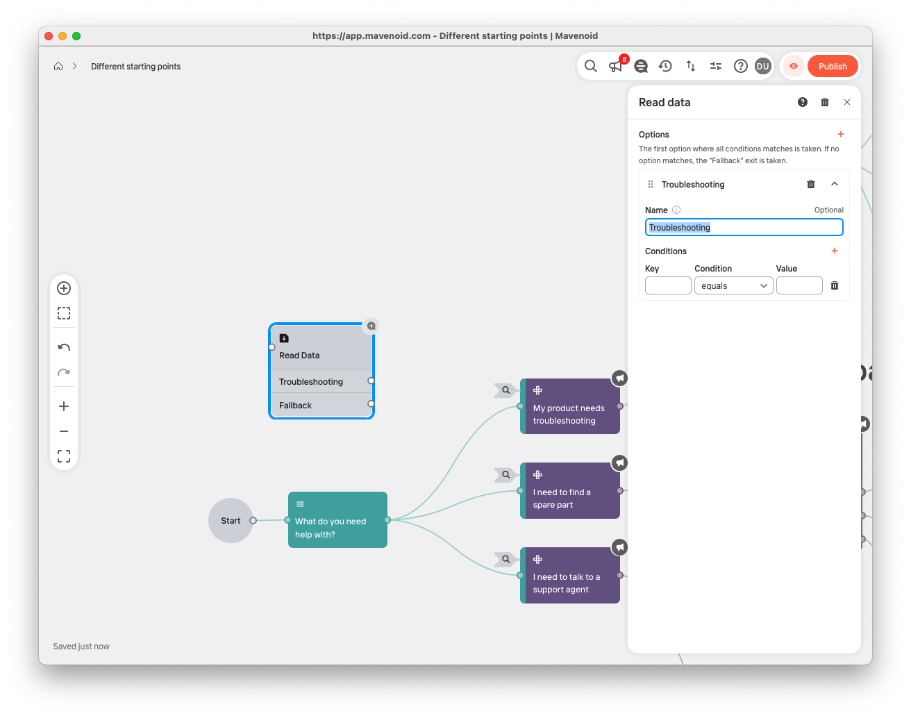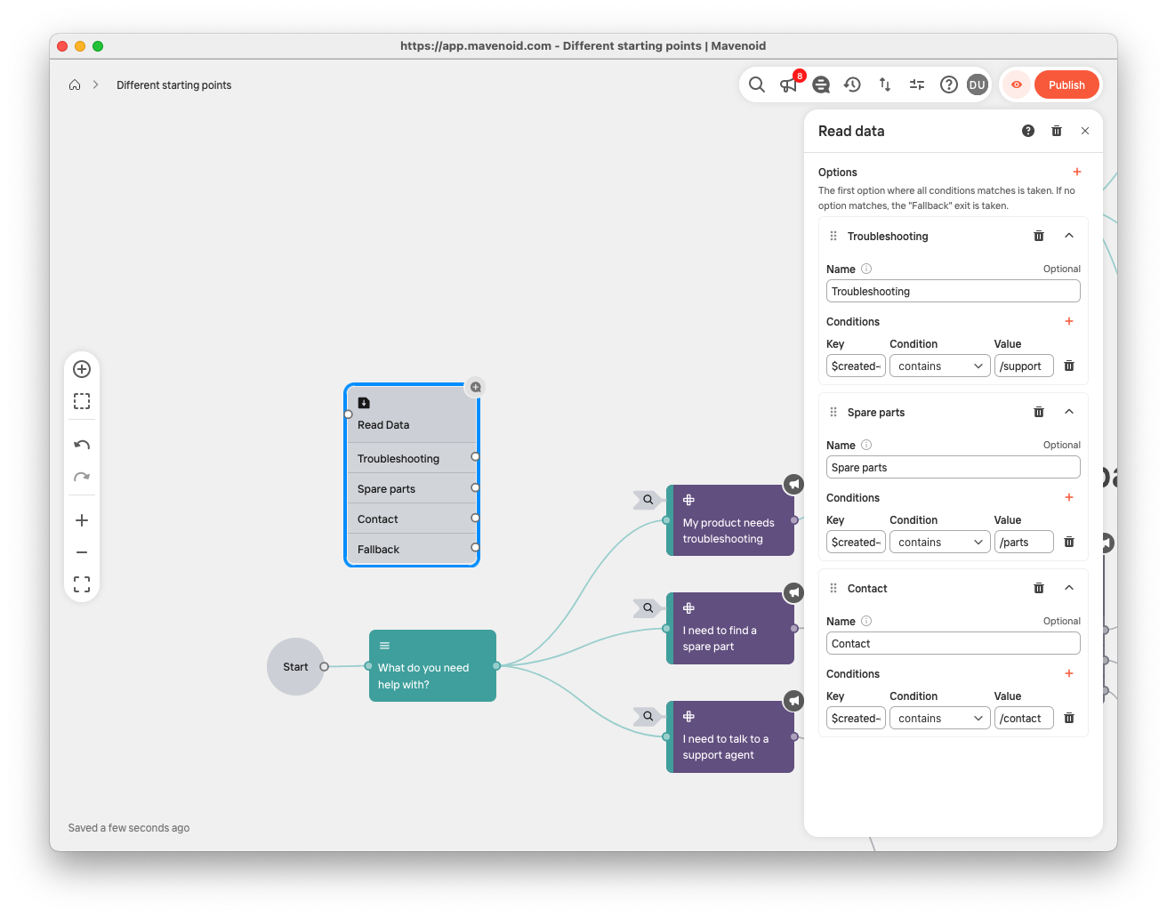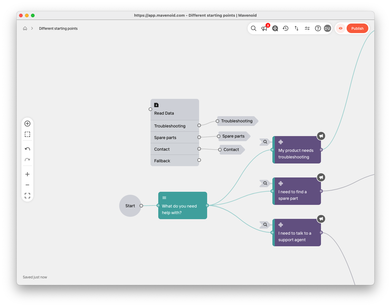 For this example, we will imagine a flow that covers three use cases: troubleshooting, spare parts, and a contact form. The start of the flow might look something like this: