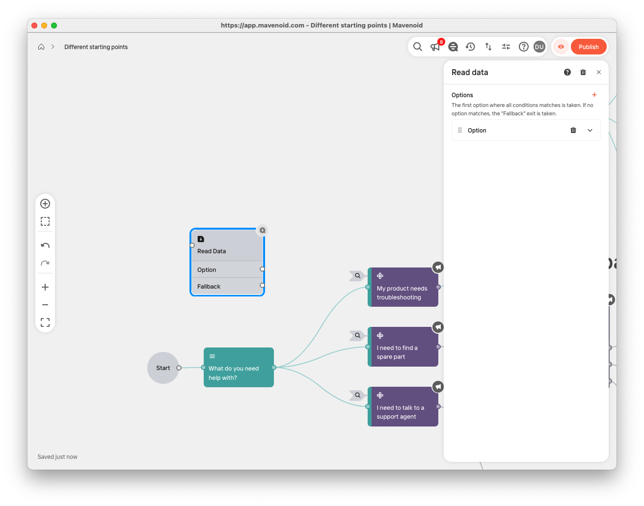 This will add the Read Data node in to the very beginning of the flow. Before anything else happens, Mavenoid will check $created-on-page-url and send the user to the appropriate section of the flow is there is one. Otherwise, it will continue to the normal start of the flow.