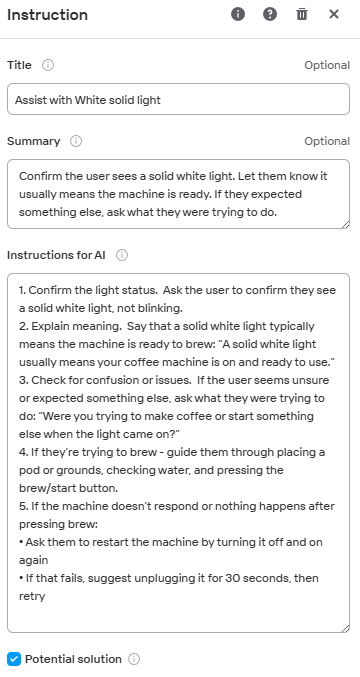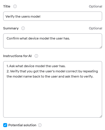 Add Instructions for AI. Write detailed information and steps that the user needs to perform to receive help on their intent.