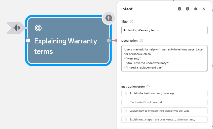 Intent nodes are used to capture the user's requests. They allow the flow's contents to be grouped into topics that can then be matched against the user's query.