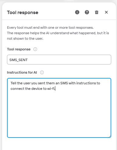 Give the Tool response a name and some instructions for the AI on what to do once the Tool response node is reached.