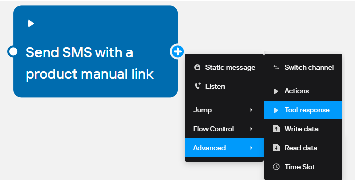 Add a Tool response node and connect it to the Action node.