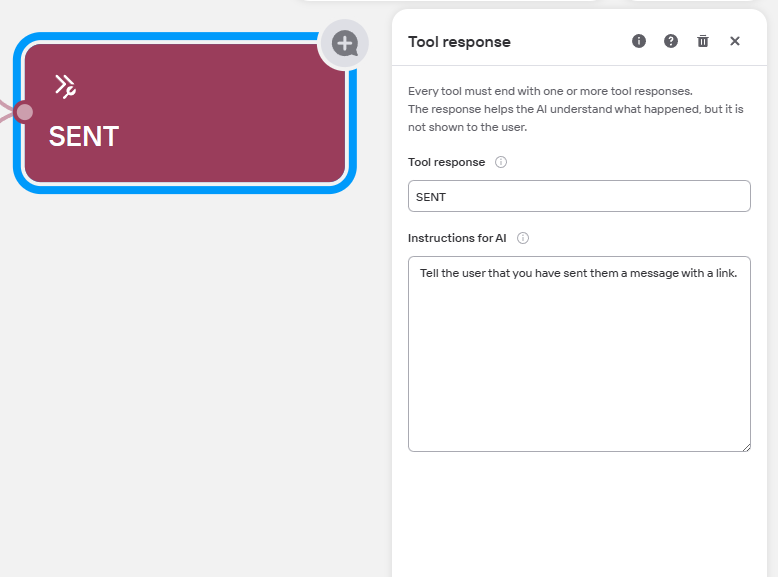 Tool response nodes instruct the voice assistant what to do after a tool call. The tool may trigger switch channel or action nodes; after the tool completes, the tool response tells the voice assistant how to continue the call.